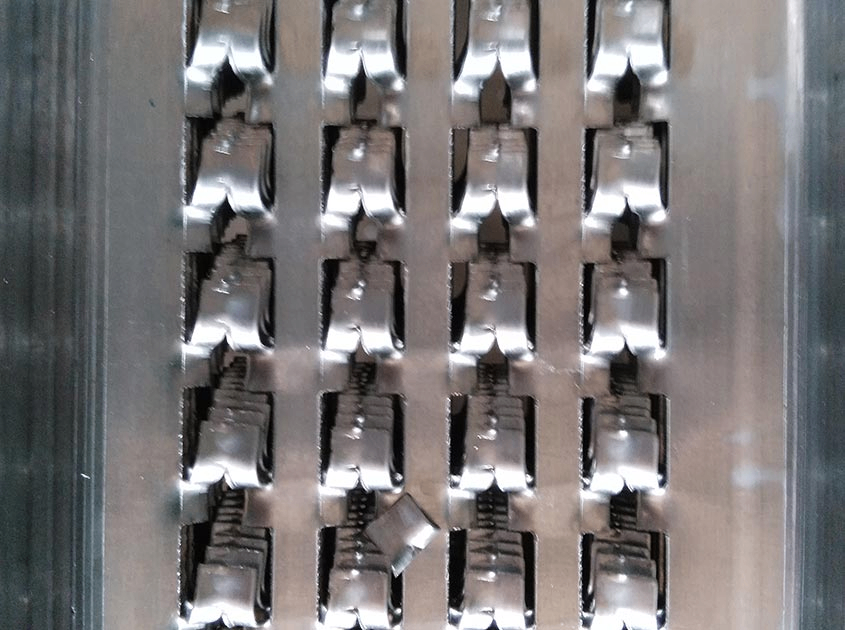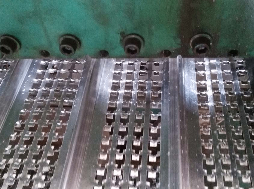 The mesh and ribs are formed on machines which first cut and press the mesh and then roll-form the ribs. At the same time the material is stretched to form an expanded mesh.